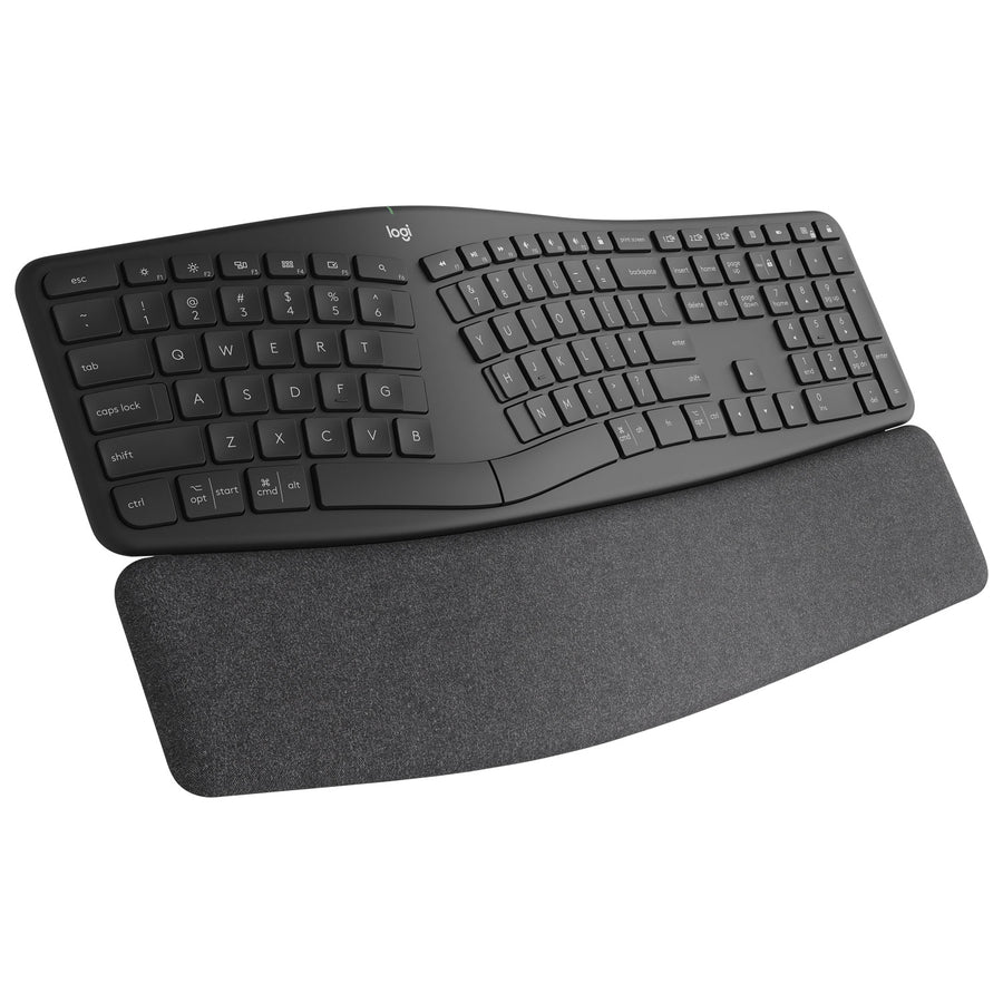 Work with ease using this Logitech ERGO K860 Bluetooth ergonomic keyboard. It features a sloping design with a split keyframe to minimize pain and strain in your wrists and hands. The curved cushioned wrist rest and tilt legs provide better support and comfort to your wrists, whether you are seated or standing.